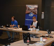 Jeder Teilnehmer saß während der Veranstaltung am eigenen Laptop. Im Bild: Tim Wilhelmi und Sebastian Gneuß
